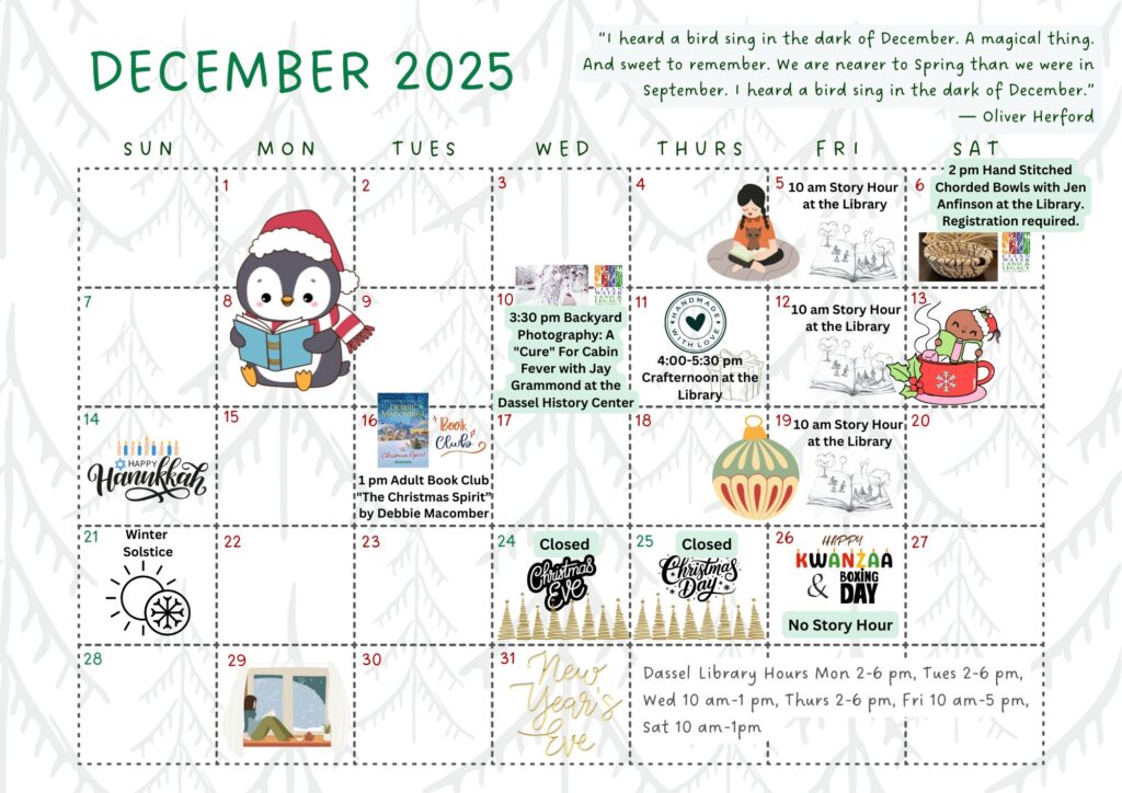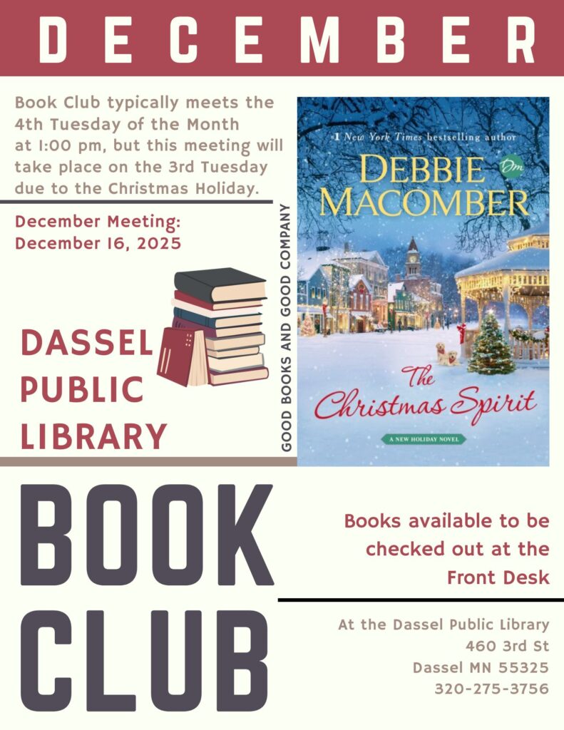 The Dassel Friends of the Library meets 4 times per year at 6 p.m. on the 1st Tuesday of these months: October, January, April, and July. The meeting is held in the library while the library is closed.
