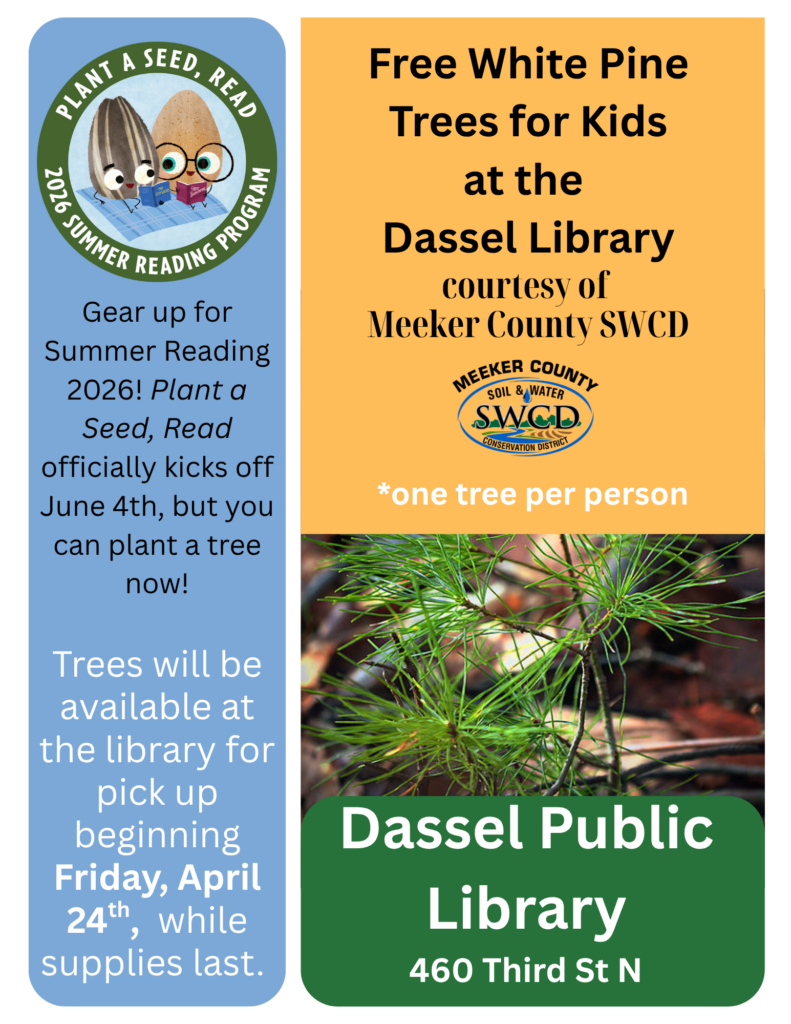 We have a preview of the summer reading program, Plant a Seed, Read – with trees! On Arbor Day, Friday, April 24, the Dassel Library will offer free trees for kids. White pine saplings will be available to pick up beginning at story hour that morning and while supplies last, courtesy of the Meeker County Soil & Water District. One tree per child. Plan to plant them as soon as possible, at minimum within a week.