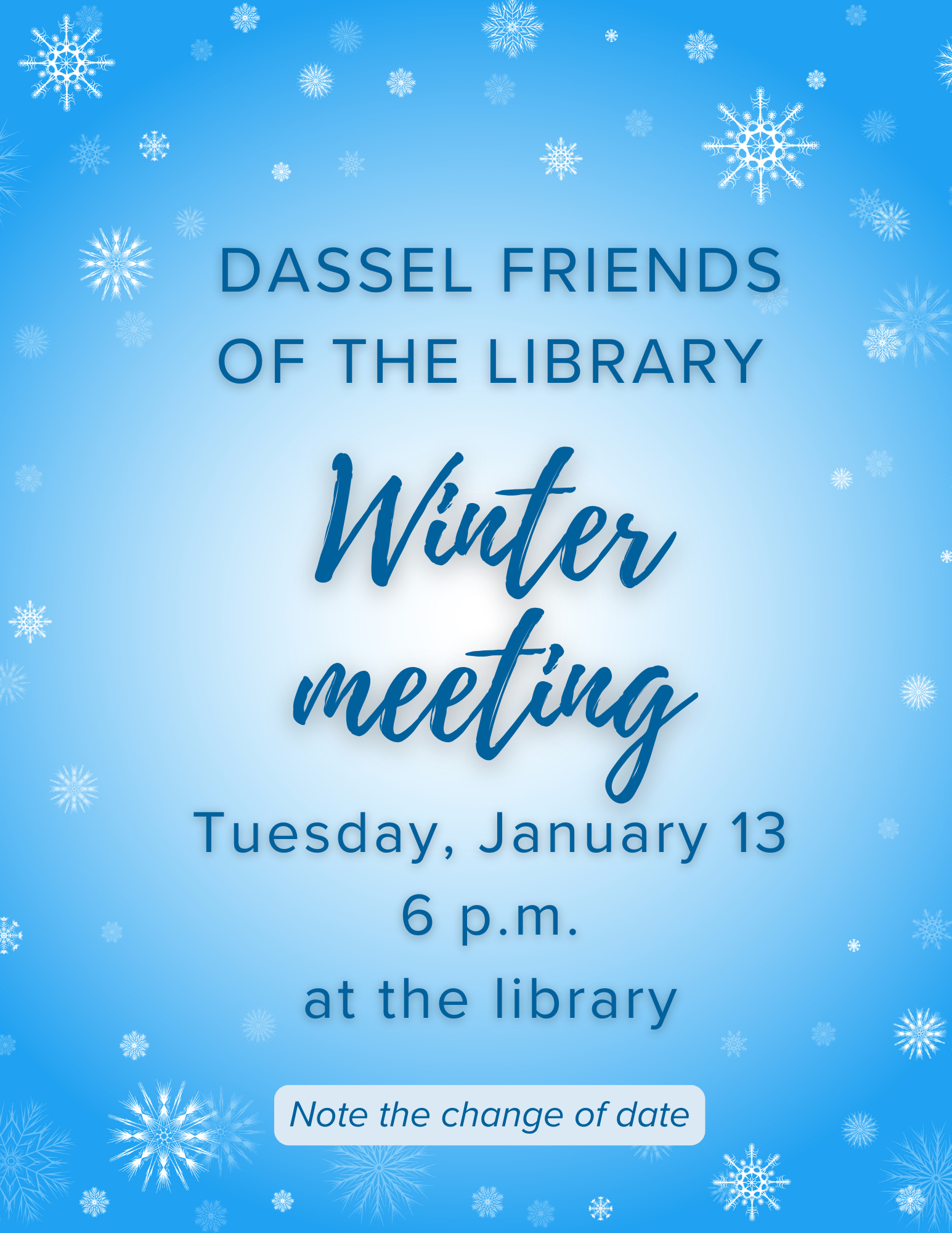 The Dassel Friends of the Library meets 4 times per year at 6 p.m. on the 1st Tuesday of these months: October, January, April, and July. The meeting is held in the library while the library is closed.