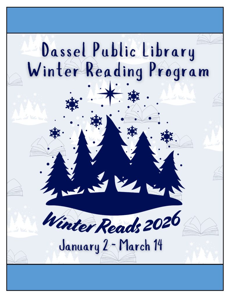 You can sign up anytime until early March. When you sign up, you’ll get a book bag, while supplies last. You’ll also get a reading log to track and rate the books you read beginning the day you sign up. If you read 3 books by the time the program is done, you can choose a small prize. If you read 3 more, you can pick an additional prize. If you turn in a card with all 6 books read by the last day of the program, you’ll be entered in a drawing for local business gift certificates, sponsored by the Friends of the Dassel Library. The program can be completed only once per year.