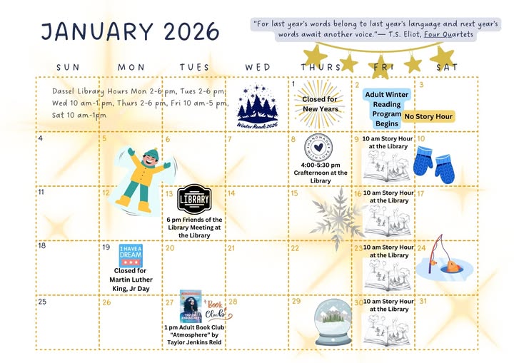 January means the start of Winter Reads, the adult winter reading program for Pioneerland Library System. The program starts at the Dassel Library on Friday, January 2, and ends Saturday, March 14.