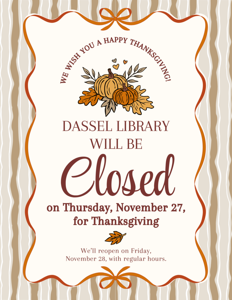 Dassel Library will offer curbside service indefinitely. Call the library at the number on the sign, 320-275-3756, if you’d like your materials brought outside. Have your library card number ready.