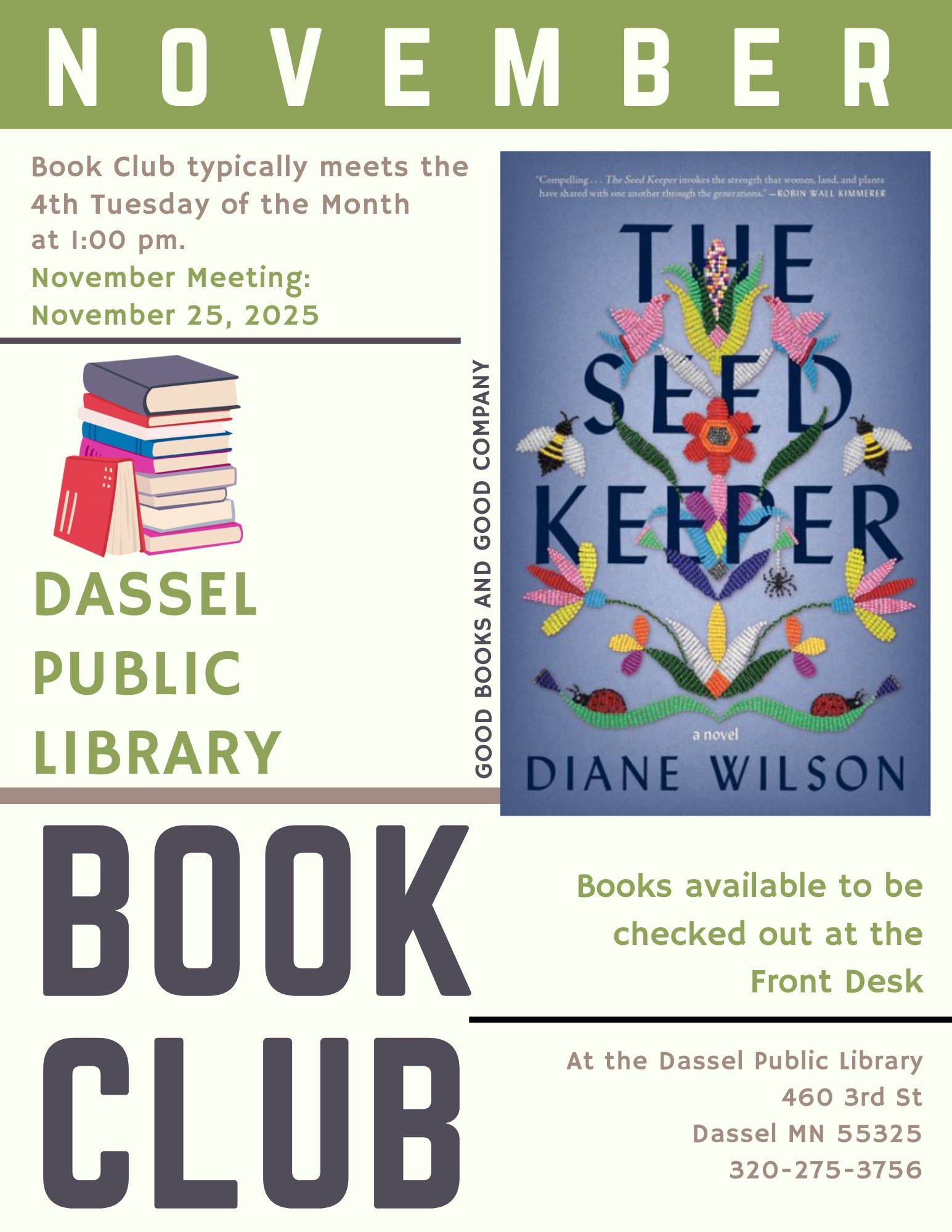 The Dassel Friends of the Library meets 4 times per year at 6 p.m. on the 1st Tuesday of these months: October, January, April, and July. The meeting is held in the library while the library is closed.